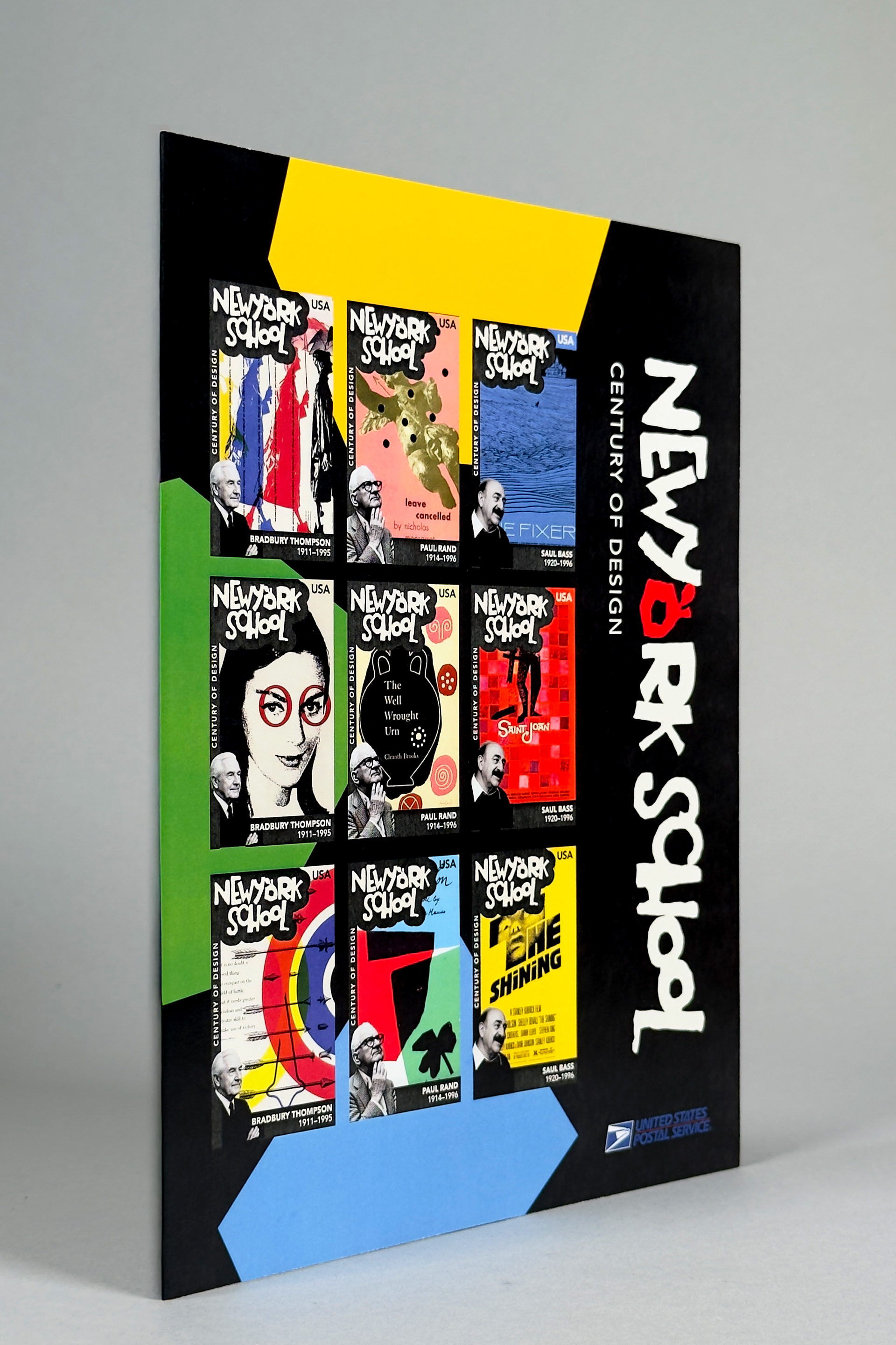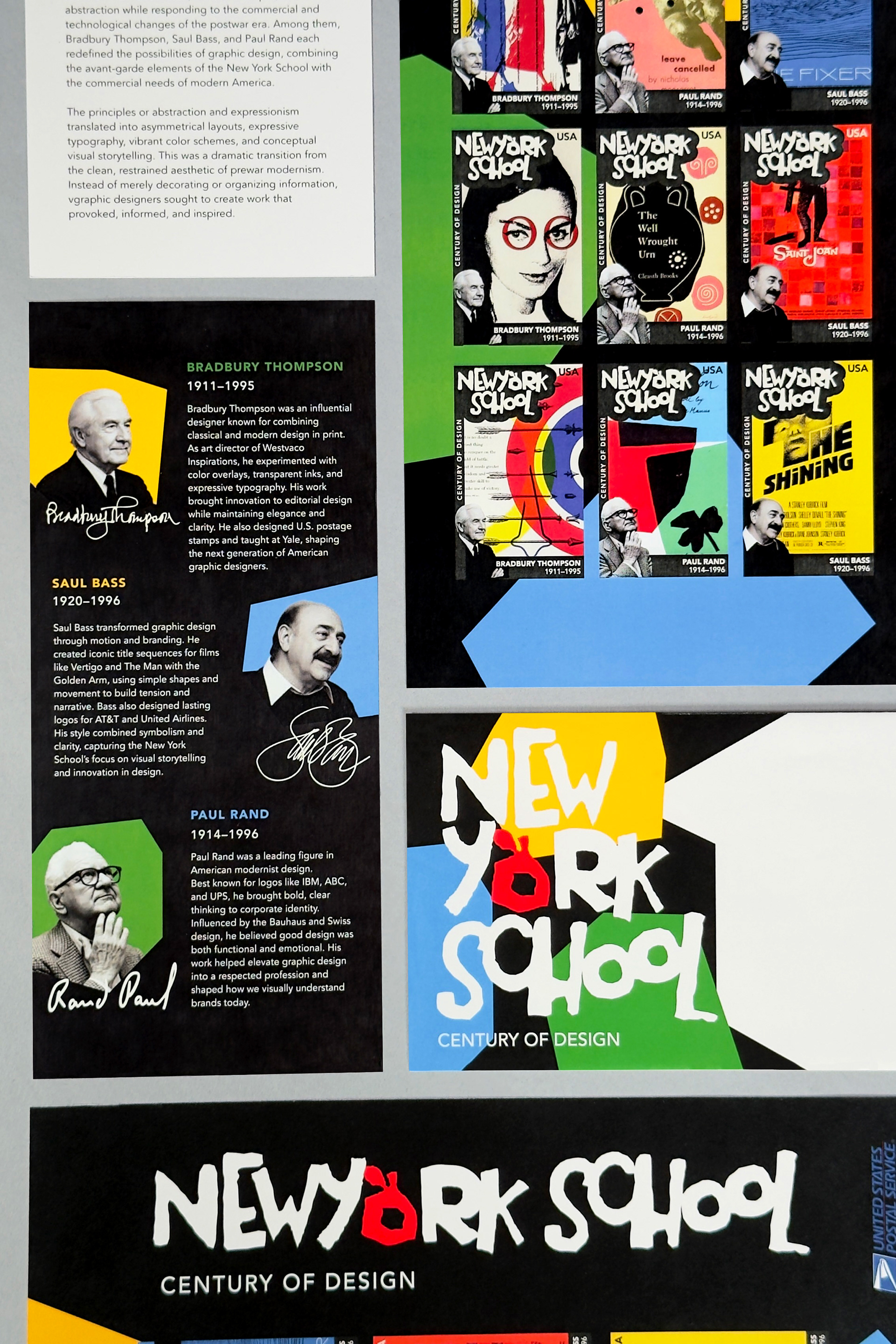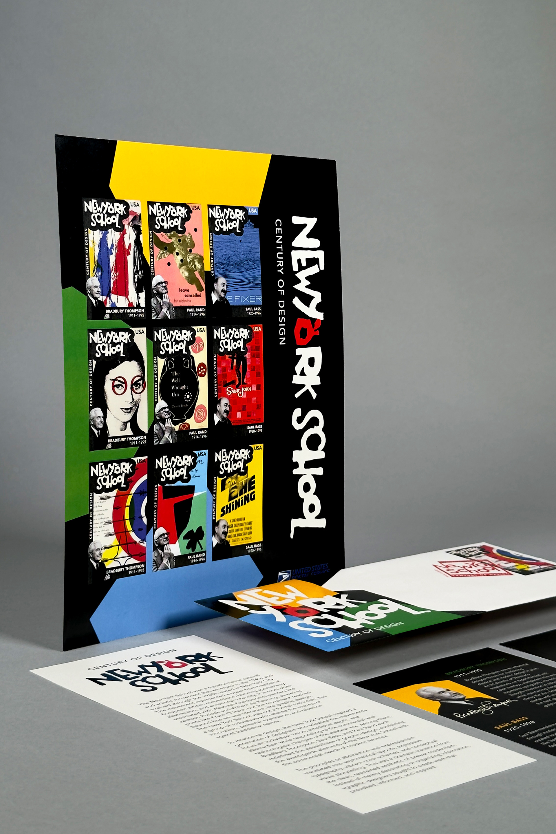 This project celebrates the impact of the New York School through a commemorative USPS stamp series and supporting print collateral. Each stamp pays tribute to the legacy of key designers—Saul Bass, Paul Rand, and Bradbury Thompson—by reimagining their most iconic works within a unified visual system. I designed the stamp layouts, promotional booklet, envelope, and first-day cover, drawing inspiration from mid-century modern design principles while incorporating bold typography and dynamic color blocking. The collection captures the spirit of the movement and its influence on contemporary graphic design.