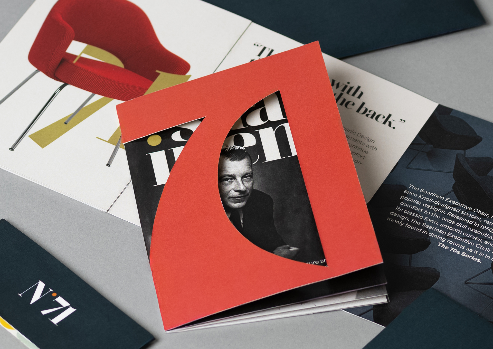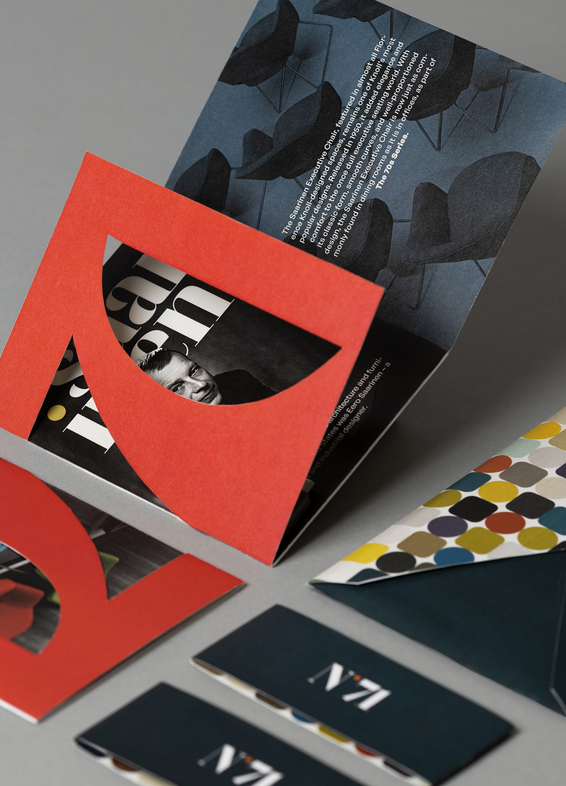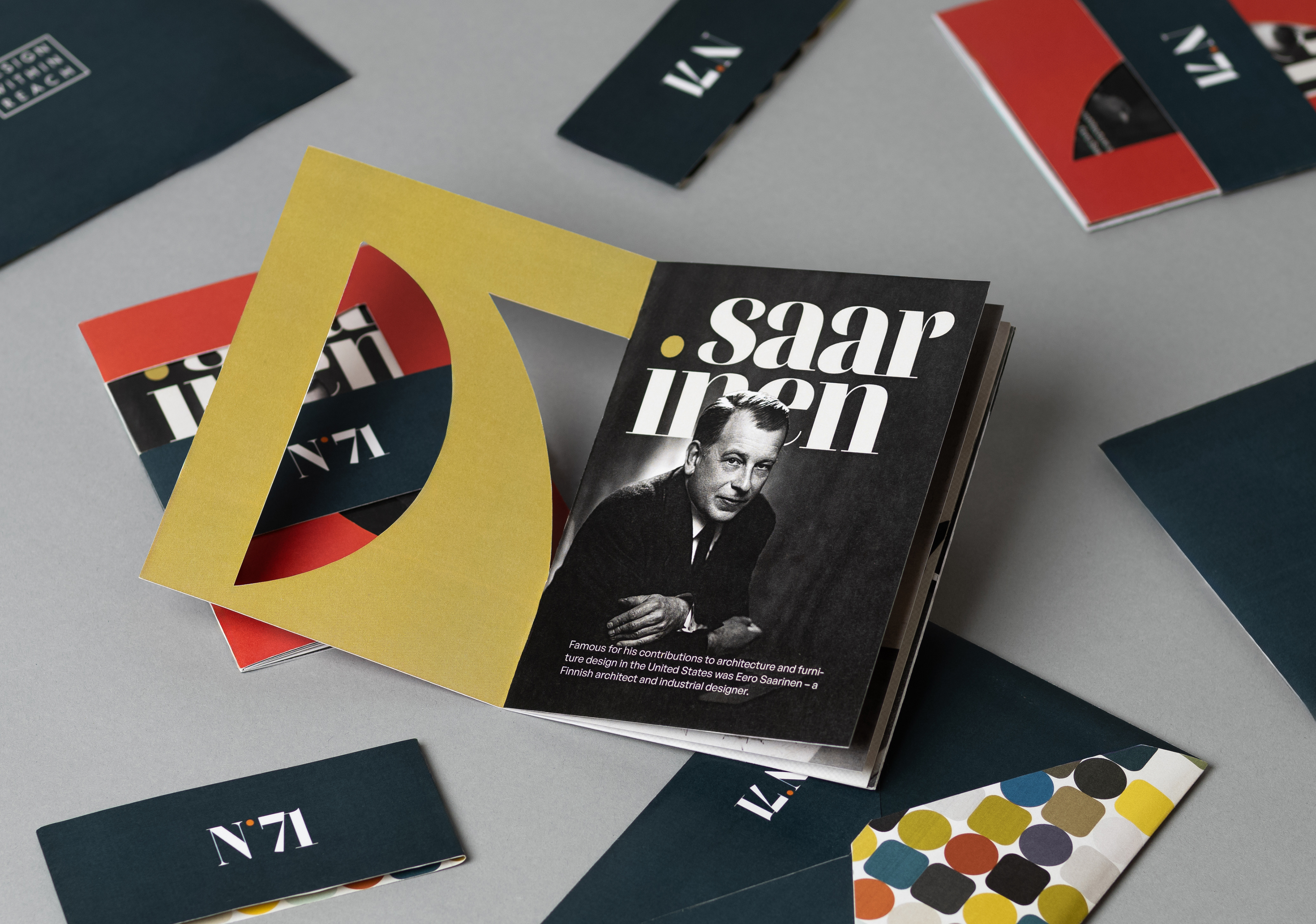 I wanted the book to resemble the chair. Initially my sketches were a slightly too on the nose, so I decided to approach my vision with more subtlety; since the most recognizable characteristic about this Saarinen chair was the whole in the back, I made a die-cut on the front cover to both resemble the number 71, and to give viewers a peek into the book.