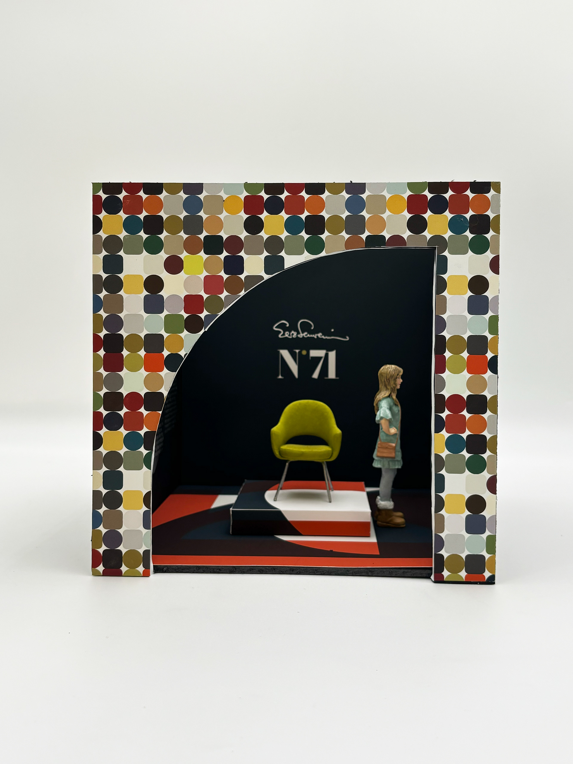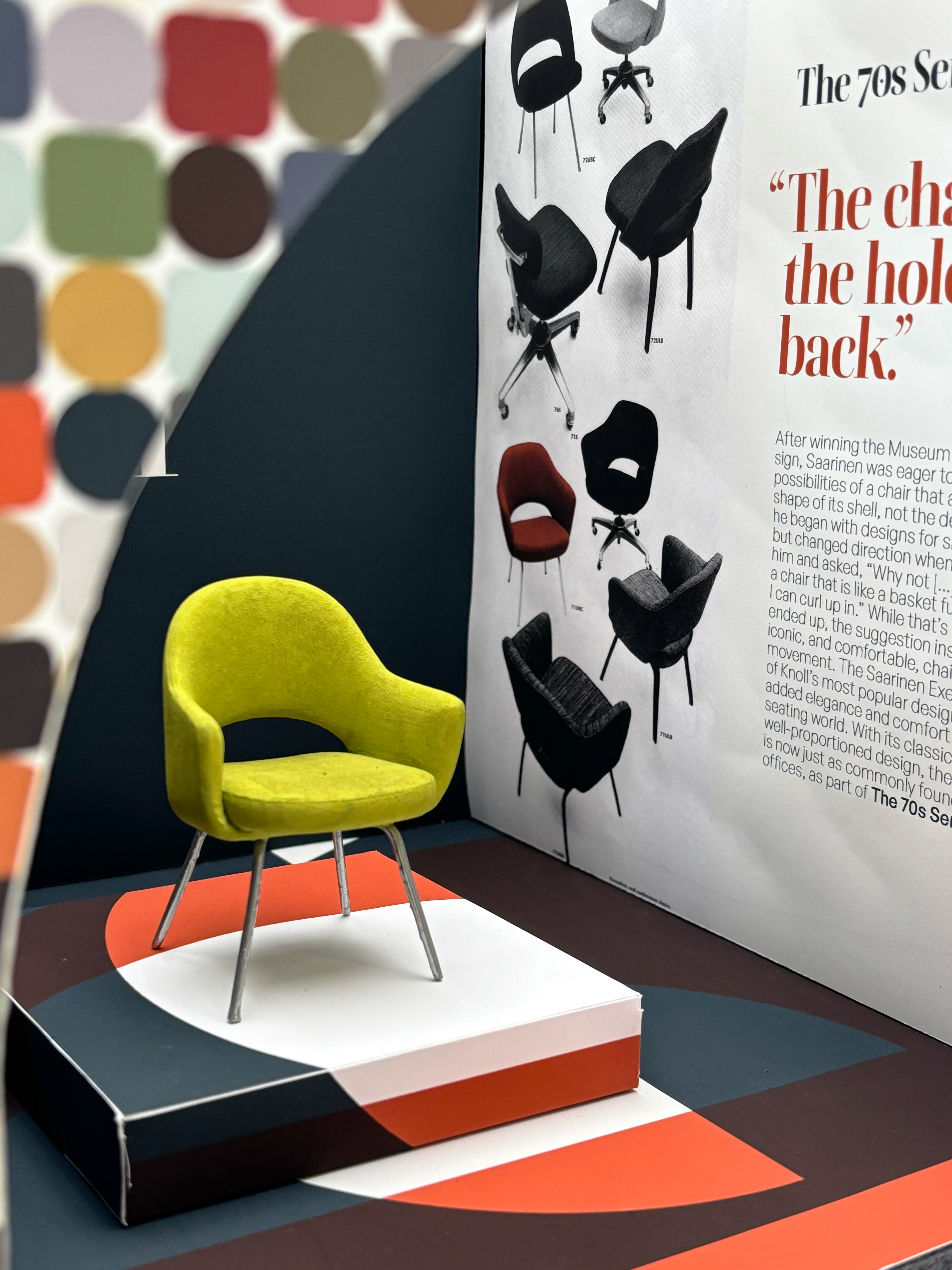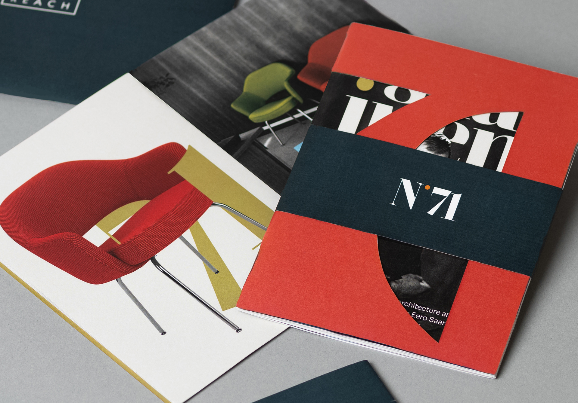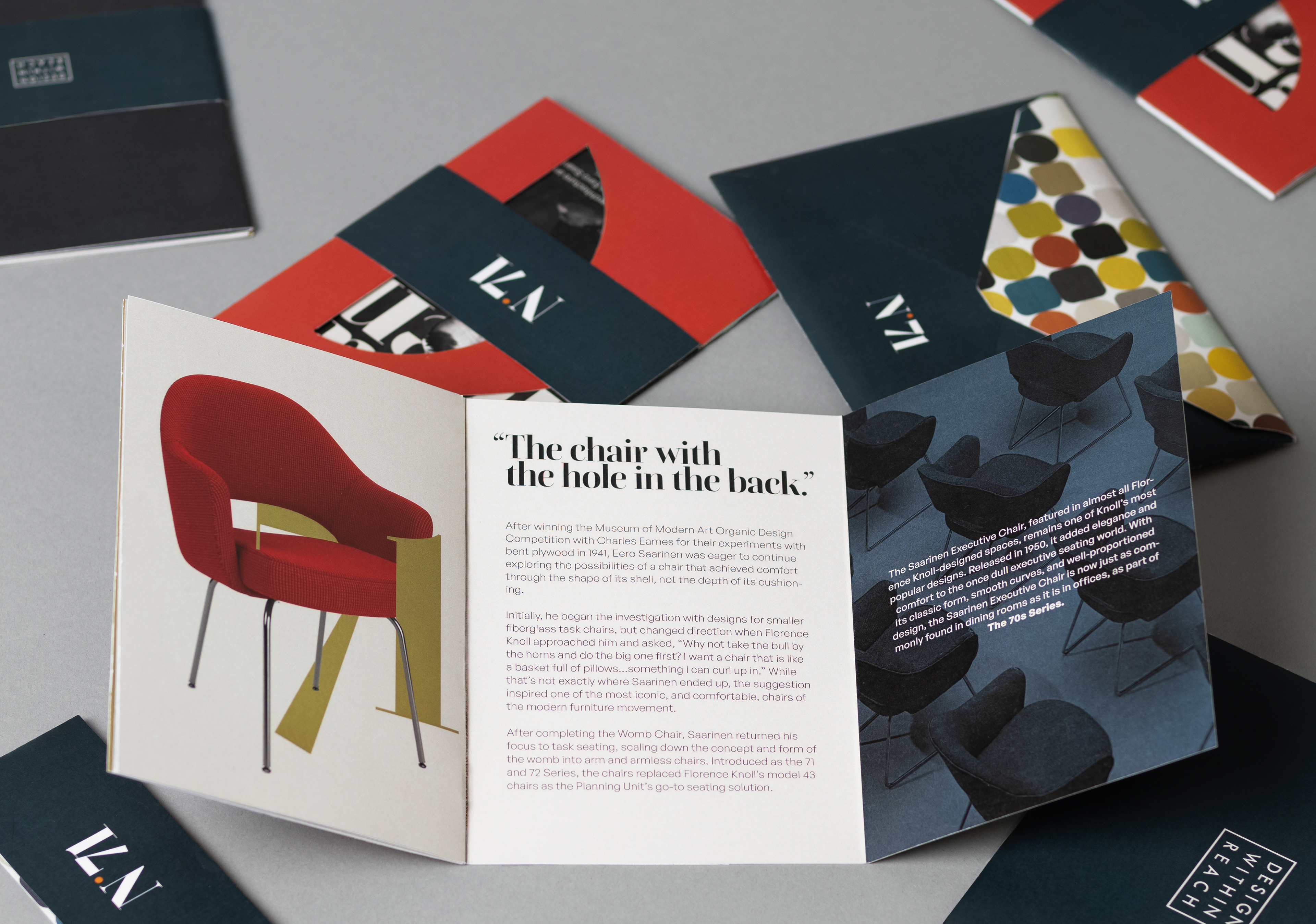 I wanted the book to resemble the chair. Initially my sketches were a slightly too on the nose, so I decided to approach my vision with more subtlety; since the most recognizable characteristic about this Saarinen chair was the whole in the back, I made a die-cut on the front cover to both resemble the number 71, and to give viewers a peek into the book.