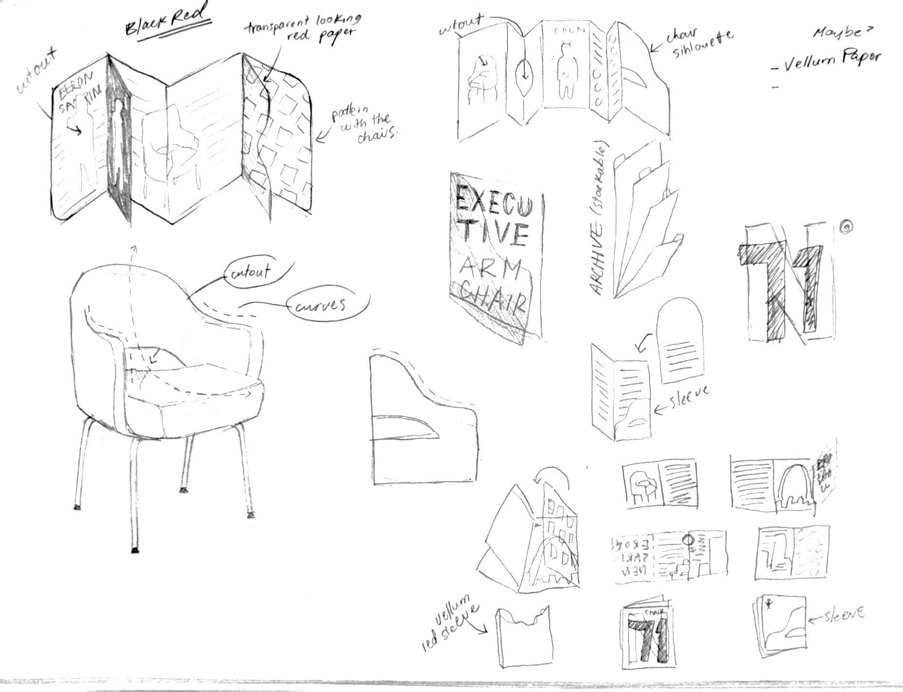 The goal of this project was to make a promotional book and exhibit maquette for a chair displayed by Design Within Reach. I was assigned Eero Saarinen's #71 chair, and my approach was to showcase the chair's elegant yet dynamic structure. Since it is mostly used in corporate spaces, I decided to keep layouts simple and structured, with some moments of playfulness. Here are some of my initial sketches.